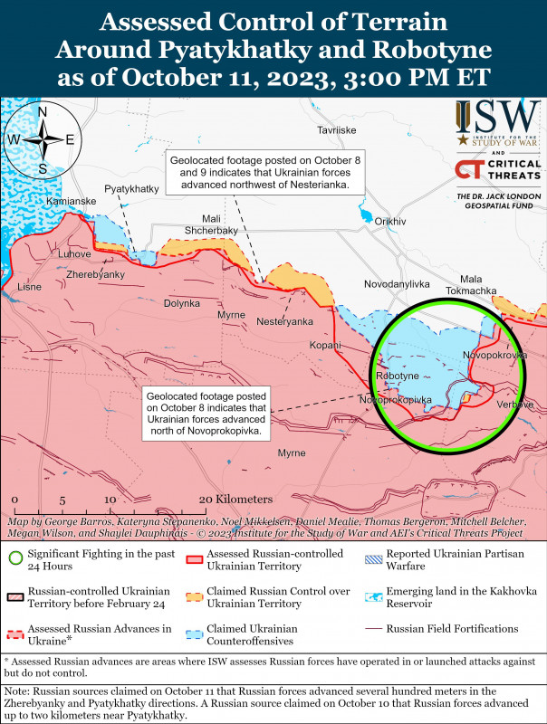 Токмацький напрямок: у смузі оборони 70-го МСП 42-ї МСД, сусіднього 1441-го МСП ТрВ, на північному заході від Новопрокопівки, ймовірно, противнику довелося відступити на південь. Праворуч 71-й і 201-й МСП поки що утримують північну околицю села, періодично контратакуючи передові підрозділи ОСУВ “Таврія” в напрямку на Роботине. Безуспішно контратакували біля Новопрокопівки та на північний захід від Вербового. Мусили відступити з Копаней і Нестерянки. Оперативно-тактичний сенс цих дій зараз обговорюють, але ймовірною причиною чергового “жесту доброї волі” є вкрай невдалі контратаки 7-ї та 76-ї десантно-штурмових дивізій, котрі зазнали великих втрат. Зараз їх відводять у тил, їхні смуги оборони передають підрозділам чмобіків.