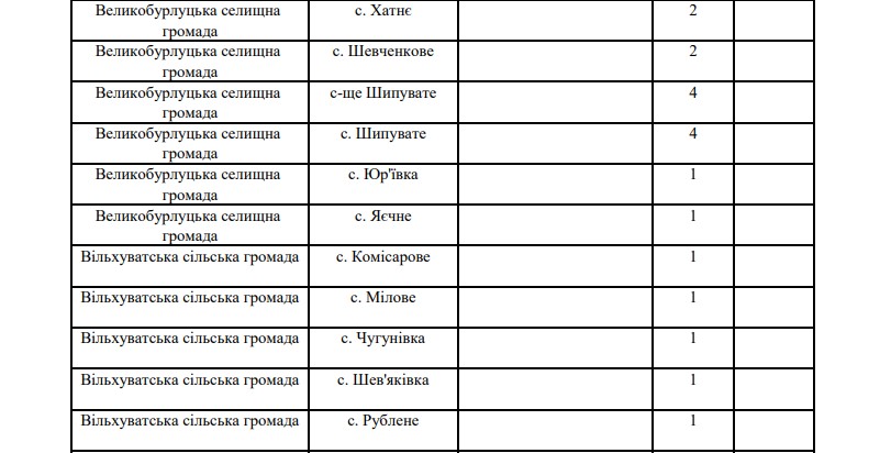 - Куп’янському районі (Куп’янська міська, Петропавлівська сільська, Шевченківська селищна, Курилівська сільська, Дворічанська селищна, Кіндрашівська сільська, Великобурлуцька селищна, Вільхуватська сільська громади),