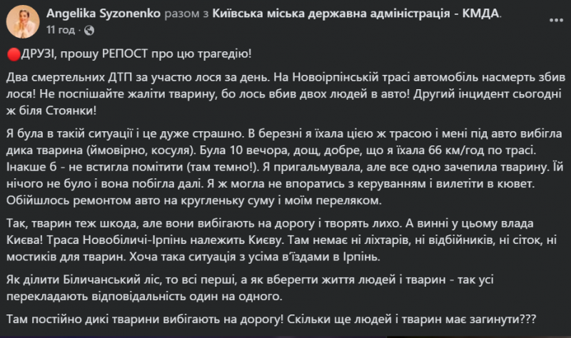 Дві аварії з лосем за один день сколихнули Київщину. 15 жовтня на Новоірпінській трасі тварина вибігла на дорогу. Водій не встиг загальмувати – машина знесла звіра. Удар був настільки сильним, що в авто загинули двоє людей. Того ж дня схожа ДТП трапилась біля Стоянки. Про це у своєму дописі в Facebook повідомила телеведуча та журналістка Анжеліка Сизоненко.