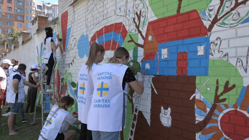 Настінний малюнок створюють біля дитячої лікарні у Полтаві. Роблять це працівники благодійного фонду "Карітас Полтава", каже керівниця проєктів фонду Алла Раковецька. За її словами, проєкт влаштували, щоб покращити емоційний стан дітей, які перебувають на лікуванні.