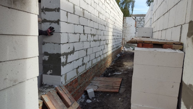 "Встановили на вікна перемички і тепер вирівнюємо для того, щоб армопояс (конструкція, що розподіляє навантаження на ту частину будівлі, яка буде під нею – ред.) залити бетоном з арматурою", ― говорить робітник підрядної організації Дмитро Заїка.