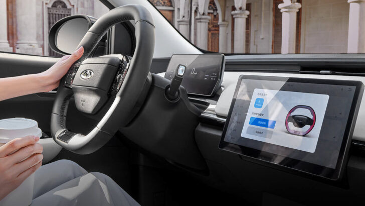Чотиримісний салон Chery Little Ant New Edition має досить мінімалістичний вигляд. Там встановили двоколірне триспицеве рульове колесо, 10,1-дюймовий центральний екран і велике дзеркало, що світиться.