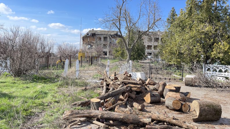 Херсонщина. Попиляні дерева лежать перед зруйнованим парканом і будівлею у Посад-Покровську, 1 квітня 2023 Фото: Суспільне Херсон