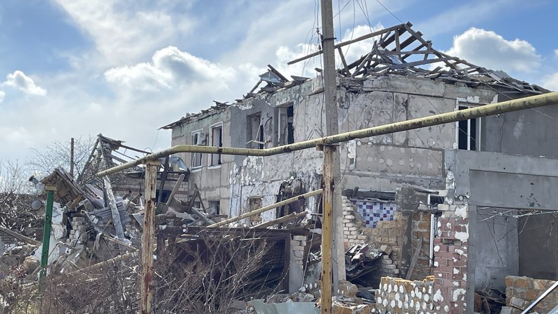 Херсонщина. Зруйнована будівлі, обірвані дроти на стовпах у Посад-Покровському, 1 квітня 2023 Фото: Суспільне Херсон