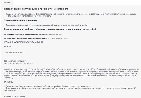 «Цікаво, що вартість робіт копійка в копійку співпадає із гранично дозволеною. Закупівлею зацікавились аудитори. 23 жовтня Держаудитслужба оприлюднила наказ про початок моніторингу цієї закупівлі. Вважають, що там є ознаки порушення законодавства у сфері публічних закупівель. Поки незрозуміло, про які саме порушення йдеться», – пише Лучик.