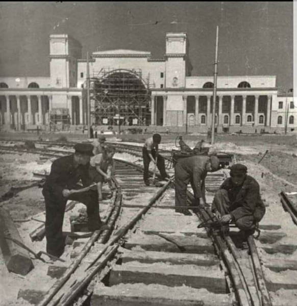 На знімку ми можемо побачити прокладання трамвайної колії біля залізничного вокзалу.