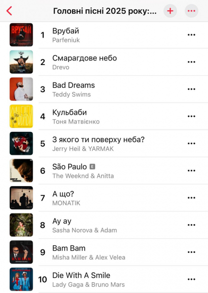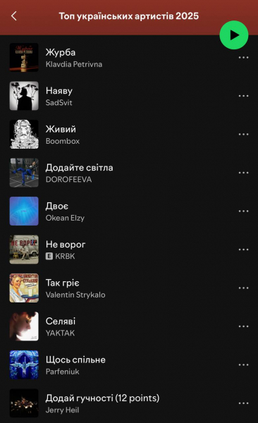 На відміну від Apple Music, у Spotify опублікували список пісень українських виконавців. У ТОП-50 усі пісні українською мовою, окрім однієї – від репера KRBK.