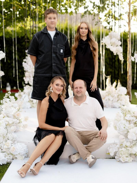 З нагоди 47-річчя Віктора Тетяна поділилася добіркою знімків, де вони позували разом із 17-річною донькою Євою та 15-річним сином Данилом на тлі локації на природі, прикрашеної білими квітами.