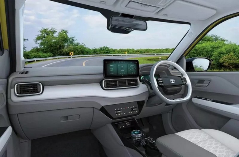 Салон Tata Punch EV не зазнав змін. На передній панелі встановлені два 10,25-дюймових екрани та сенсорні кнопки. Електрокросовер має 366-літровий задній та 14-літровий передній багажники.