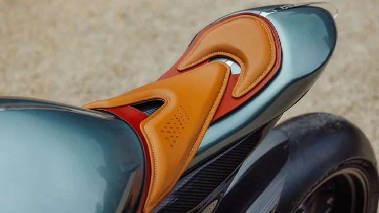 Конкретно цей мотоцикл Aston Martin AMB 001 – 63-й у серії. Його карбонові обтікачі пофарбовані у світло-оливковий колір, а сидіння обшили дорогою шкірою.
