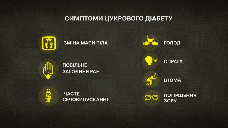 До симптомів цукрового діабету належить, зокрема, зміна маси тіла, повільне загоювання ран, часте сечовипускання, підвищене відчуття голоду і спраги, втома, а також погіршення зору.