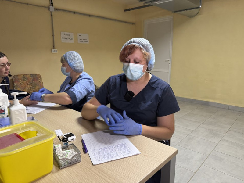 "Обробляємо руки, вставляємо індикатор в глюкометр, обробляємо пальчик пацієнта спиртовими серветками. І, власне, скарифікатором робимо прокол. Підноситься глюкометр до пальця, визначається рівень цукру, оголошуємо пацієнту, даємо результат і собі записуємо. Найвищий був 13,9 мілімоль на літр, але це людина, яка хворіє цукровим діабетом, тобто вона знає, що для неї це можливо", — розповіла медсестра Ліна Чубенко.