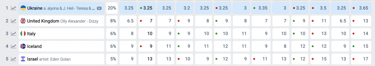 Ще чотири дні тому співачки мали 18% шансів на перемогу, а друге місце в рейтингу займав британський співак Оллі Олександр з 9%. Актуальна таблиця розміщена на сайті Eurovision World.