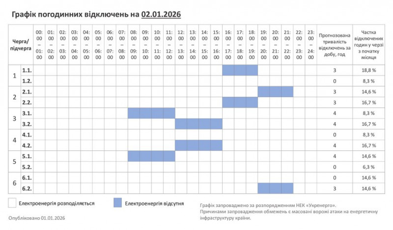 Графік погодинних відключень світла на 2 січня 2026 року. Хмельницькобленерго