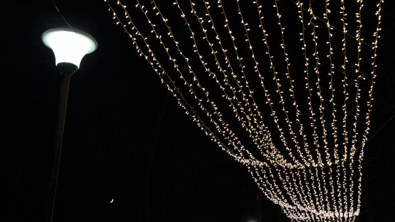 Гірлянда у сквері Хмельницького, яка при відключеннях працює від генератора, грудень 2025 року. Суспільне Хмельницький