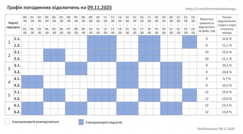 Графік погодинних відключень на 9 листопада на Хмельниччині. Хмельницькобленерго