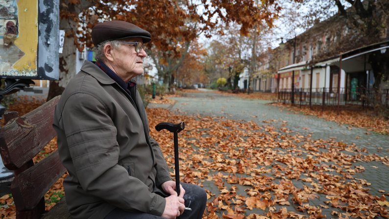 Чоловік сидить на лавці у середмісті Херсона, листопад 2025 року. Суспільне Херсон/Олександр Корняков