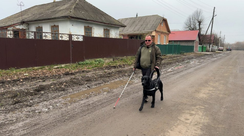 Ветеран на прогулянці із собакою-поводирем у селі Маниківці, Хмельниччина, 17 листопада 2025 року. Суспільне Хмельницький