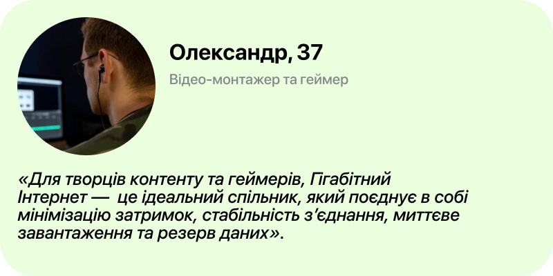 Моя діяльність пов’язана з обробкою значних об’ємів відеоматеріалів, тому для мене критично важливо мати надійне інтернет-з’єднання з найменшими затримками (найменший Ping). Раніше, звичайний інтернет регулярно підводив в найвідповідальніші моменти, що викликало роздратування.