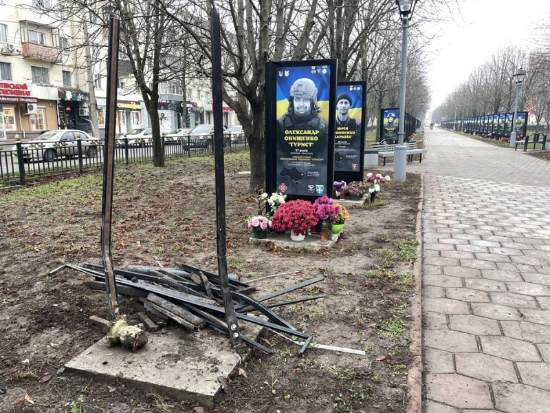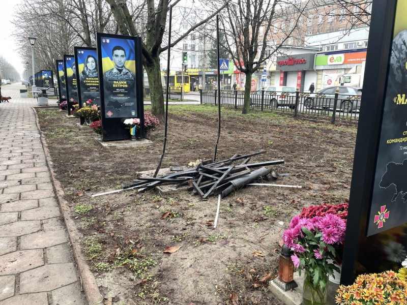 "Обстежили місце, склали відповідний акт обстеження. Взагалі пошкоджено дві металеві конструкції з нанесеними портретами героїв і три конструкції самої огорожі Каштанової алеї. Дві секції майже повністю знищені, і третя з іншої сторони Каштанової алеї теж пошкоджена", — прокоментував директор КП "Декоративні культури" Ігор Ляшко.