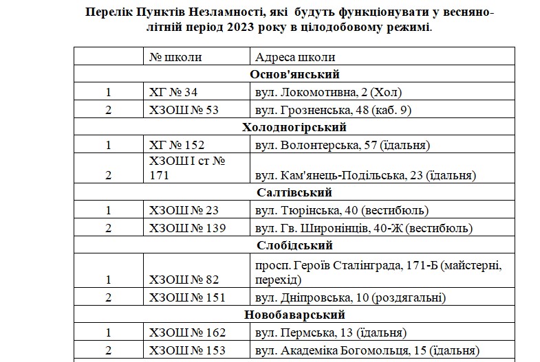 Згідно, з переліком, опублікованим на сайті Харківської міськради, навесні та влітку цього року цілодобово працюватимуть 18 “пунктів незламності” у школах — по два “пункти” у кожному з дев’яти районів. Вони обладнані у вестибюлях, кабінетах, їдальнях, роздягальнях, підвалі.