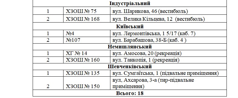 Згідно, з переліком, опублікованим на сайті Харківської міськради, навесні та влітку цього року цілодобово працюватимуть 18 “пунктів незламності” у школах — по два “пункти” у кожному з дев’яти районів. Вони обладнані у вестибюлях, кабінетах, їдальнях, роздягальнях, підвалі.