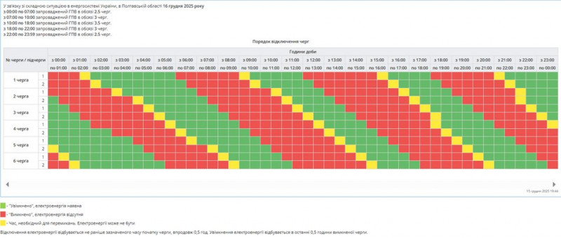У Полтавській області 16 грудня застосують графіки погодинних відключень електроенергії. Це пов’язано з нестачею потужності в енергосистемі, спричиненою російськими обстрілами.