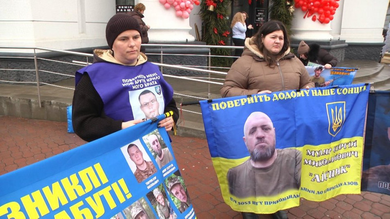 Жінки тримають прапори із зображеннями захисників, що зникли безвісти, Хмельницький, 13 лютого 2026 року. Суспільне Хмельницький