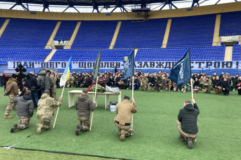 Прощання з розвідником Іваном Щоголевим на стадіоні Металіст. Березень 2023 року. Фото: Дмитро Гребінник/Суспільне Харків