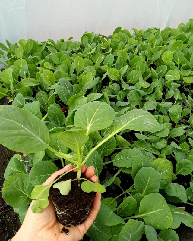 Розсаду капусти, яку тримають у руці, на тлі багатьох інших молодих рослин, Хмельниччина. Іванна Білоус
