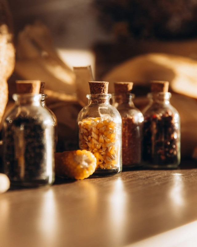 Зерна зберігаються в невеликих прозорих скляних пляшечках із корковими кришками, Хмельниччина. Іванна Білоус