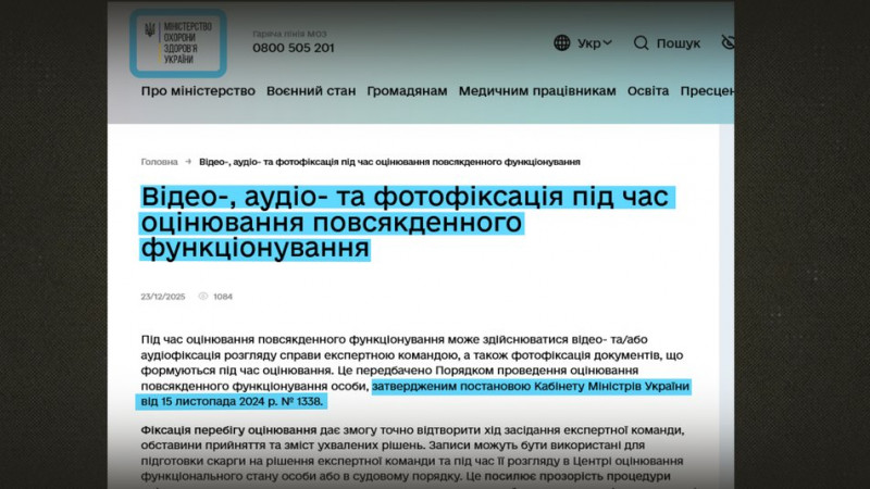 Із 1 січня 2026 року, згідно з постановою Кабінету Міністрів України №1338, прийом пацієнта під час комісії з призначення інвалідності обов'язково фіксуватимуть на аудіо. Вже понад рік експертизу щодо встановлення інвалідності відповідно до законодавства для повнолітніх осіб здійснюють експертні команди з оцінювання повсякденного функціонування особи замість МСЕКів.