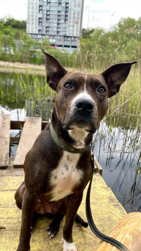 Господар пітбуля Альфи загинув під час обстрілу. Снаряд поцілив у його двір, коли він був на вулиці. Там, у дворі, його і поховали. Собаку до себе забрав сусід і доглядав її, поки в Бахмут не потрапили рятувальники з Kyiv Animal Rescue.