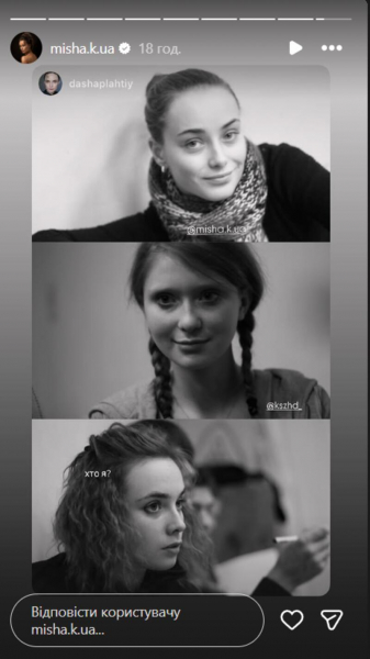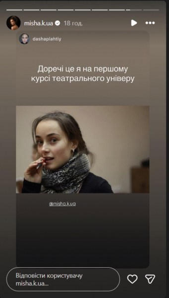 В інстаграм-сторіз знаменитість зробила репост архівних фотографій зі сторінки своєї колеги, акторки Дар’ї Плахтій, відомої за роллю Марічки у фільмі «Довбуш». За словами Мішиної, знімки були зроблені під час її навчання на першому курсі театрального вишу.