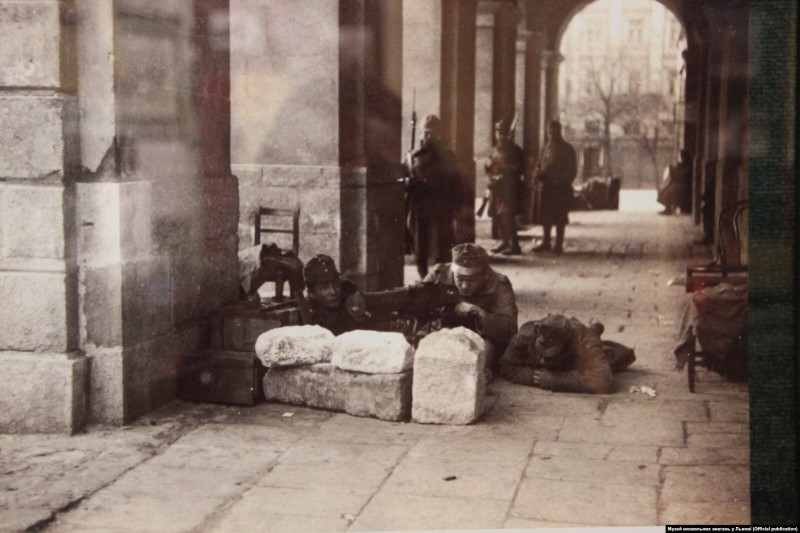 Українські військові тримають оборону біля входу до львівської ратуші у листопаді 1918 року