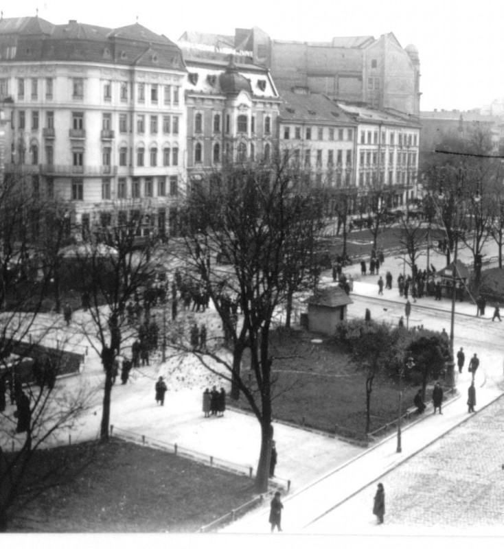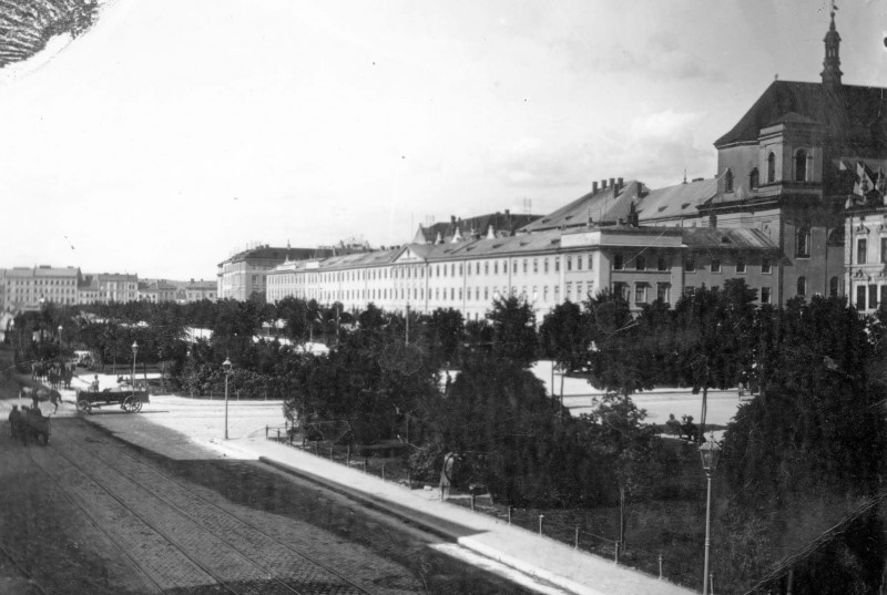 Так довжелезний будинок Головного державного фінансового управління, збудований ще в кінці XVIII – першій половині XIX століття в стилі казенного австрійського класицизму, який тягнувся від костелу Єзуїтів (Гарнізонний храм Святих Петра і Павла) до Національного музею, був зруйнований німецькими бомбардуваннями під час Другої світової, і до 1947 року його розібрали.