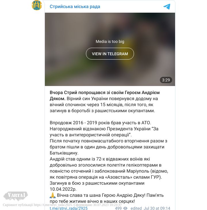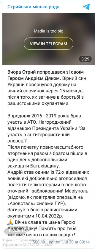 В суботу, 29 липня у Стрию попрощалися зі своїм Героєм Андрієм Дяком. Вірний син України повернувся додому на вічний спочинок через 15 місяців, після того, як загинув в боротьбі з рашистським окупантом. Про це повідомила Стрийська міська рада.