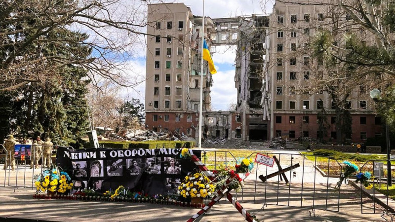 Миколаївці вшанували пам’ять загиблих під час влучання крилатої ракети у будівлю облради 29 березня 2022 року. Люди принесли квіти та лампадки. В пам’ять про жертв російської агресії в області були приспущені прапори. Рівно рік тому тут загинули 37 людей. Фото: Валентина Гурова/Суспільне Миколаїв