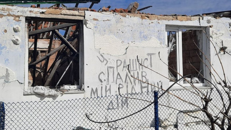 Зруйнований будинок у селі Квітневе. Жителі декілька днів жили в окупації та вісім місяців під обстрілами. До повномасштабної війни тут мешкало до 700 людей, а станом на 2 квітня їх менш ніж двісті. Фото: Назарій Рубаняк/Суспільне Миколаїв