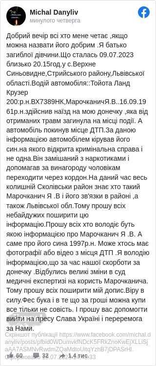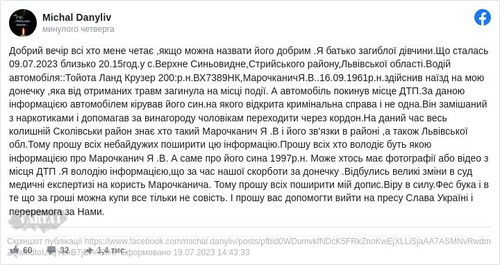 “Добрий вечір всім хто мене читає, якщо можна назвати його добрим. Я батько загиблої дівчини. Що сталась 09.07.2023 близько 20.15год. у с.Верхне Синьовидне, Стрийського району, Львівської області. Водій автомобіля: Тойота Ланд Крузер 200:р.н. ВХ7389НК ,Марочканич Я.В. 16.09.1961р.н. здійснив наїзд на мою донечку ,яка від отриманих травм загинула на місці події. А автомобіль покинув місце ДТП. За даною інформацією автомобілем керував його син, на якого відкрита кримінальна справа і не одна. Він замішаний з наркотиками і допомагав за винагороду чоловікам переходити через кордон. На даний час весь колишній Сколівський район знає хто такий Марочканич Я.В. і його зв’язки в районі, а також Львівської обл. Тому прошу всіх небайдужих поширити цю інформацію. Прошу всіх хто володіє буть якою інформацією про Марочканич Я.В. А саме про його сина 1997р.н. Може хтось має фотографії або відео з місця ДТП. Я володію інформацією, що за час нашої скорботи за донечку відбулись великі зміни в суд медичні експертизі на користь Марочканича. Тому прошу всіх поширити мій допис. Віру в силу Фейсбука і в те що за гроші можна купи все, тільки не совість. І прошу вас допомогти вийти на пресу Слава Україні і перемога за Нами” – йдеться в дописі батька загиблої дівчинки.