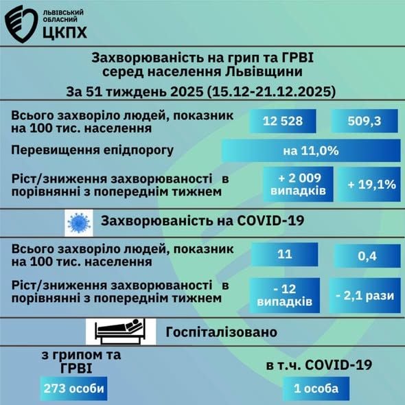 Минулого тижня, з 15 по 21 грудня, на Львівщині на грип та ГРВІ захворіло 12 528 мешканців області, що на 2 тис. більше, ніж у попередній тиждень. Захворюваність вперше цього епідсезону перевищила епідпоріг на 11%, повідомили у Львівському обласному центрі контролю і профілактики хвороб.