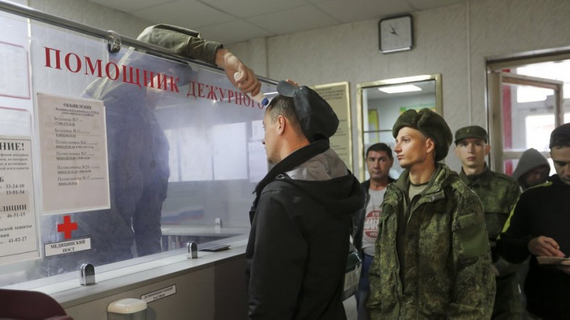 Російським мобілізованим перевіряють температуру на призовному пункті у Волгоградській області, 24 вересня 2022 року, ілюстративне фото: AP