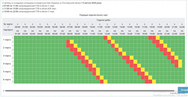 У Полтавській області 9 квітня ввели графіки погодинних відключень електроенергії. Це пов’язано з нестачею потужності в енергосистемі.