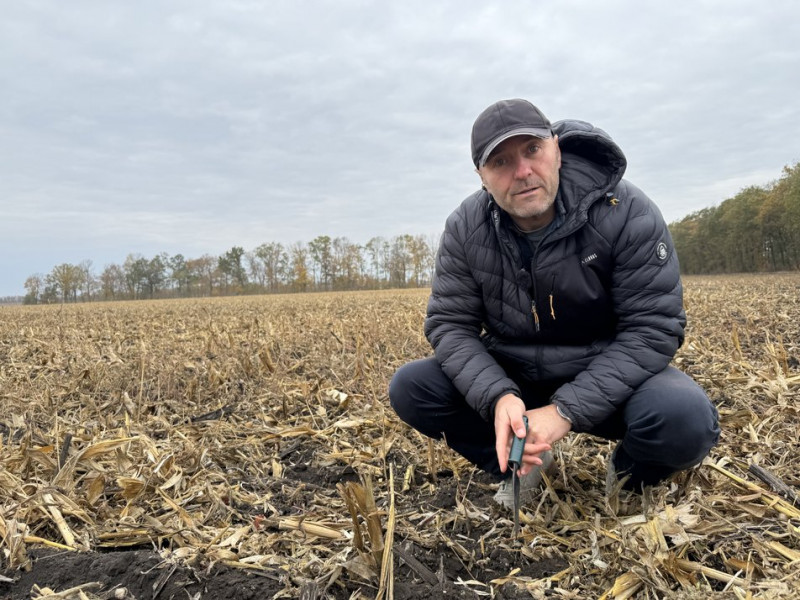 Головний агроном Віталій Товстошкур, який перевіряє глибину залягання посіяного зерна. Суспільне Полтава