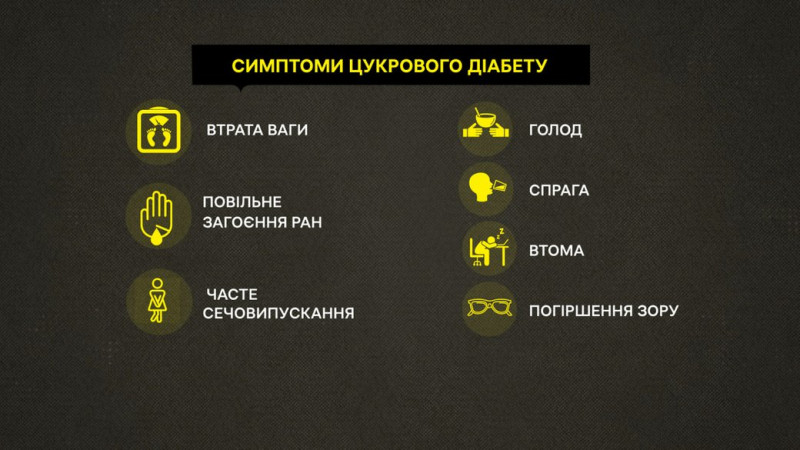 До симптомів цукрового діабету належить, зокрема, втрата ваги, повільне загоювання ран, часте сечовипускання, підвищене відчуття голоду і спраги, втома, а також погіршення зору, розповіла ендокринологиня Златослава Шаєнко.