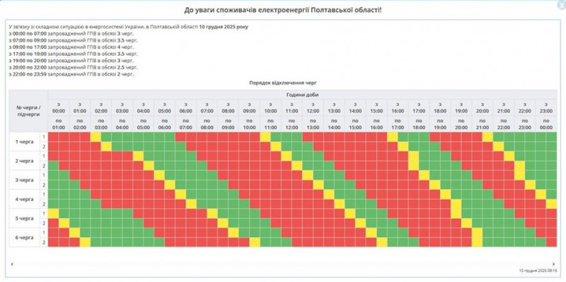 У Полтавській області 10 грудня оновили графіки погодинних відключень світла, які запровадили через дефіцит потужності в енергосистемі внаслідок обстрілів РФ. Зміни запровадили у зв'язку зі складною ситуацією в енергосистемі України.
