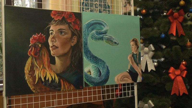 Жінка з тигром, косулею та мечем. Перед відвідувачами постають десять полотен, на яких зображені жінки з різними їхніми тотемними тваринами. Кожна чіпляє за душу, каже відвідувач виставки Вадим Столярик: "Для мене особливо глибокою роботою виявилася ця, де зображений орел і дівчина з кинджалом. Вона відображає наше сьогодення, на мою думку. Для мене це як наше сьогодення, наше прагнення до перемоги, боротьба і водночас гідна єдність і закритість в собі".