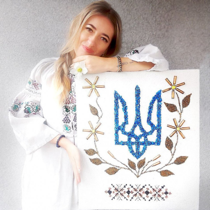 "На 12 картинах один узор вишиванки. Символізм у тому, що є 12 місяців у році, 12 святих апостолів. Вважаю, що картини сакральні й духовні, тому що створюю кожну з певним наміром, позитивними думками. Дві більші картини "25 узорів" показують красу, багатство, велич нашої держави. Вишиванки — знак того, що Україна буде жити вічно в своїх традиціях. Герб України зі смальти, каміння та гільз є знаком незламності та відродження.