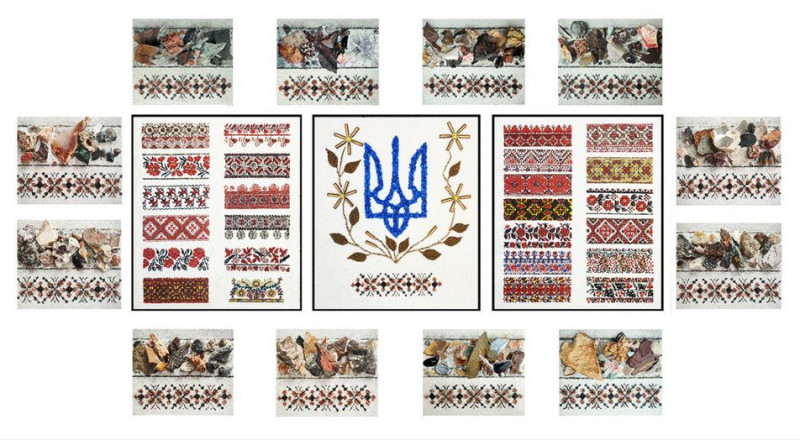 "В експозиції є 12 малих картин з єдиним орнаментом; Герб України зі смальти, каміння та гільз; дві великі роботи "25 узорів", що представляють орнаменти усіх 24 регіонів України та Криму".