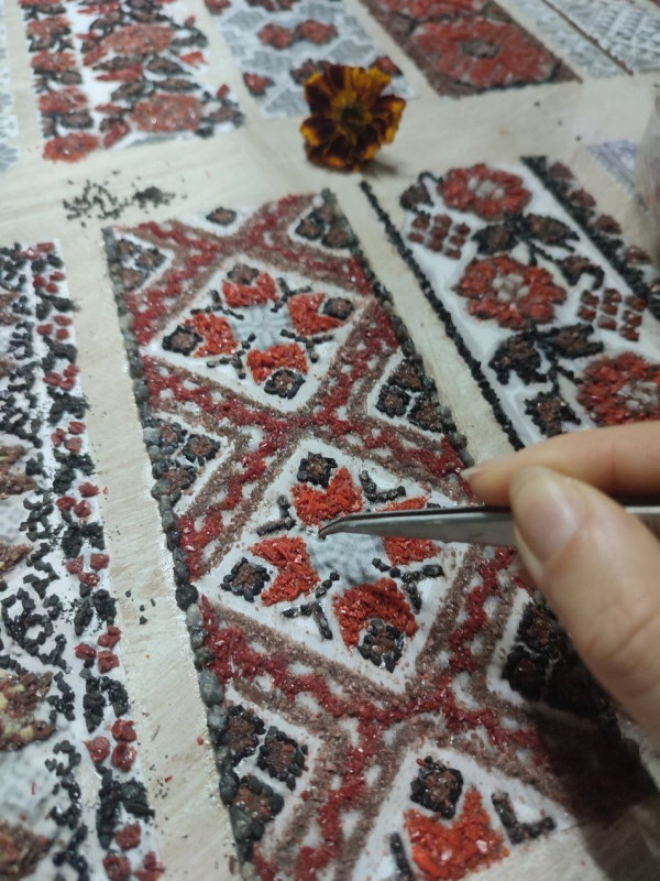 За словами майстрині, роботи з серії "Українська вишивка вічності" створені з натурального каміння та мінералів України. Вона складається з 15 картин.